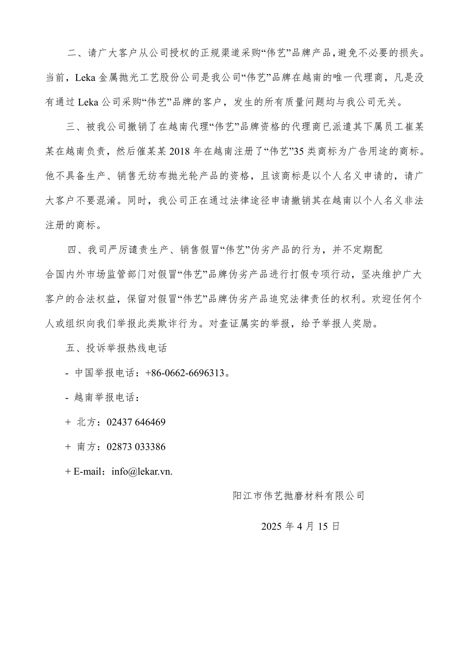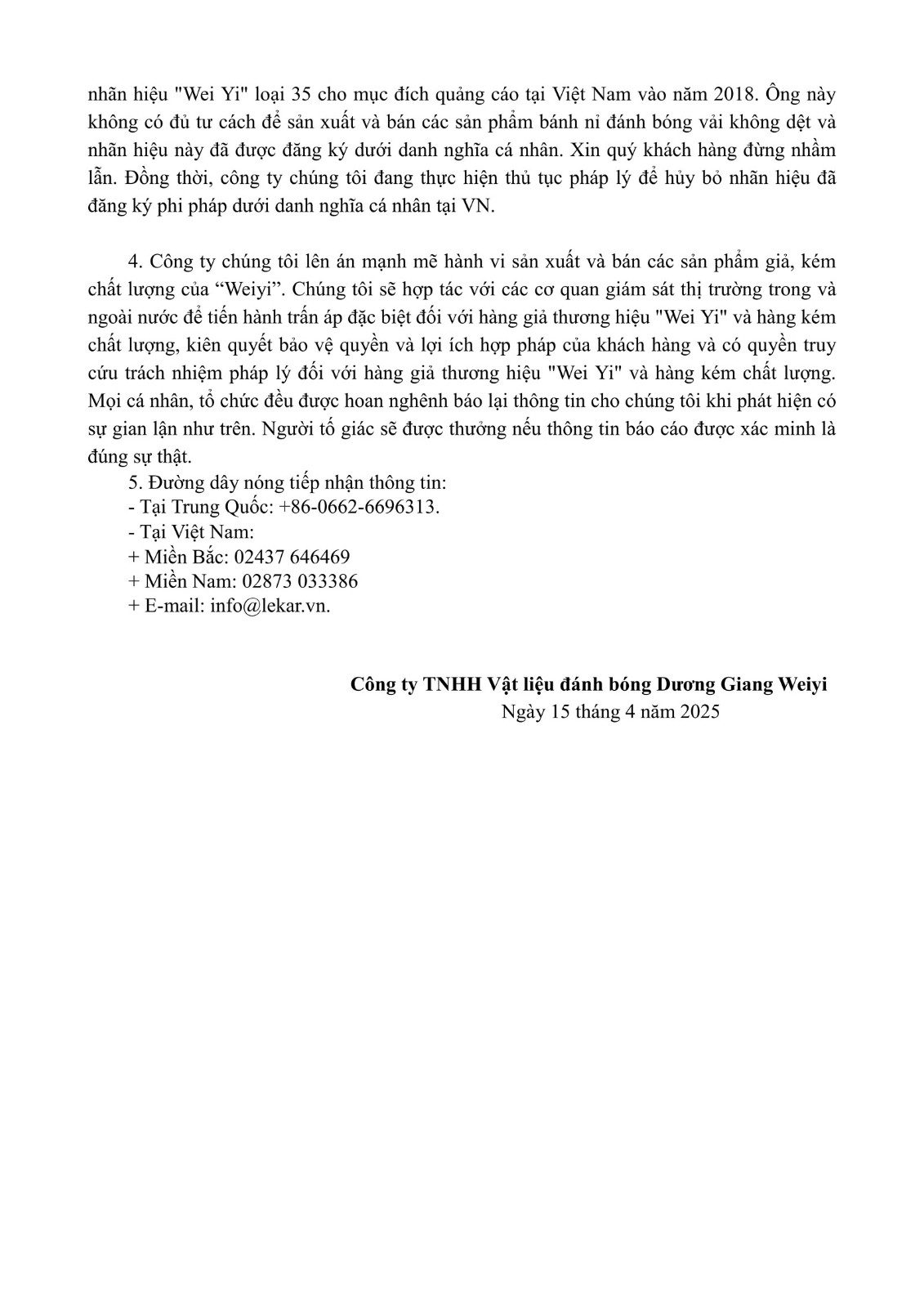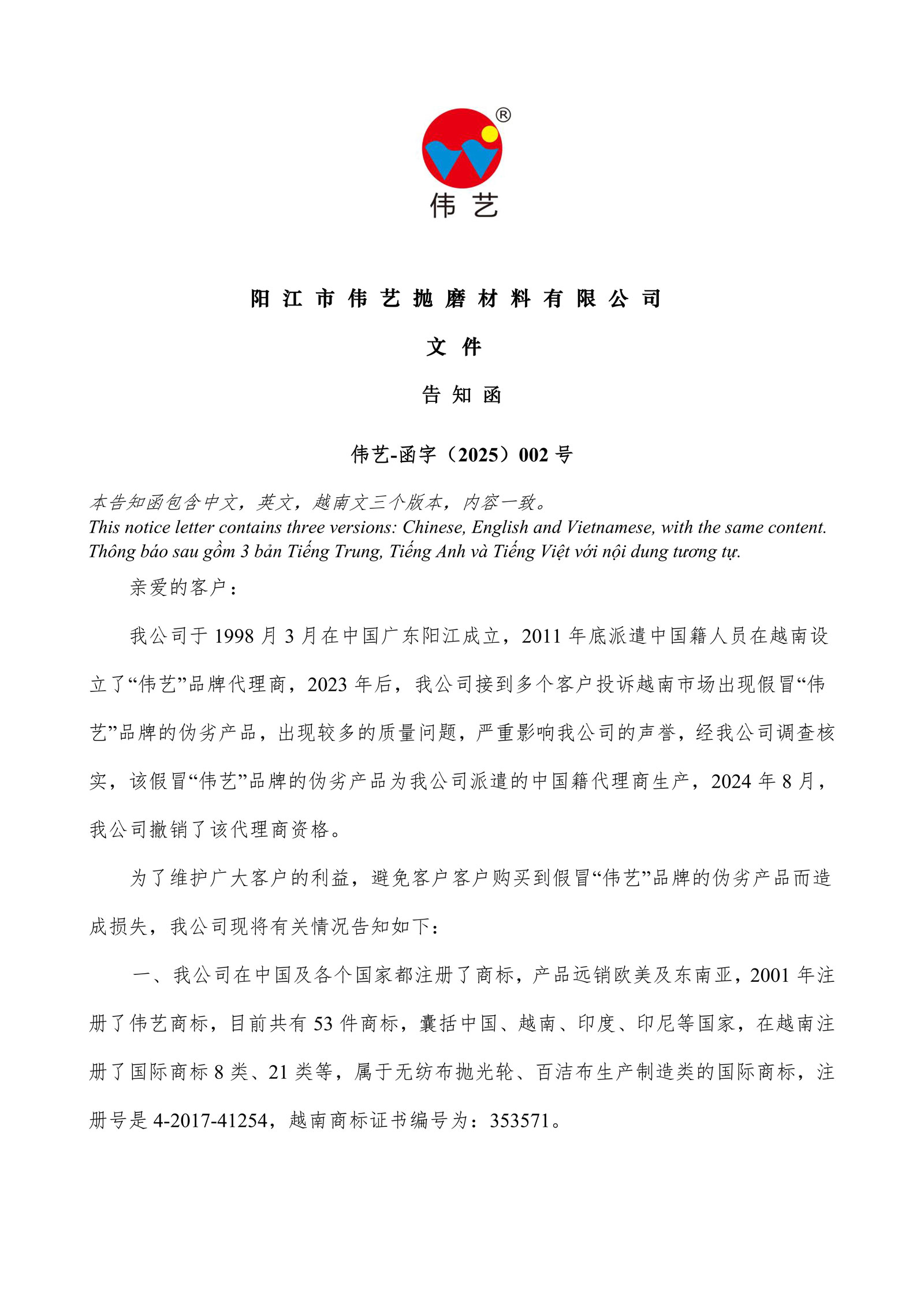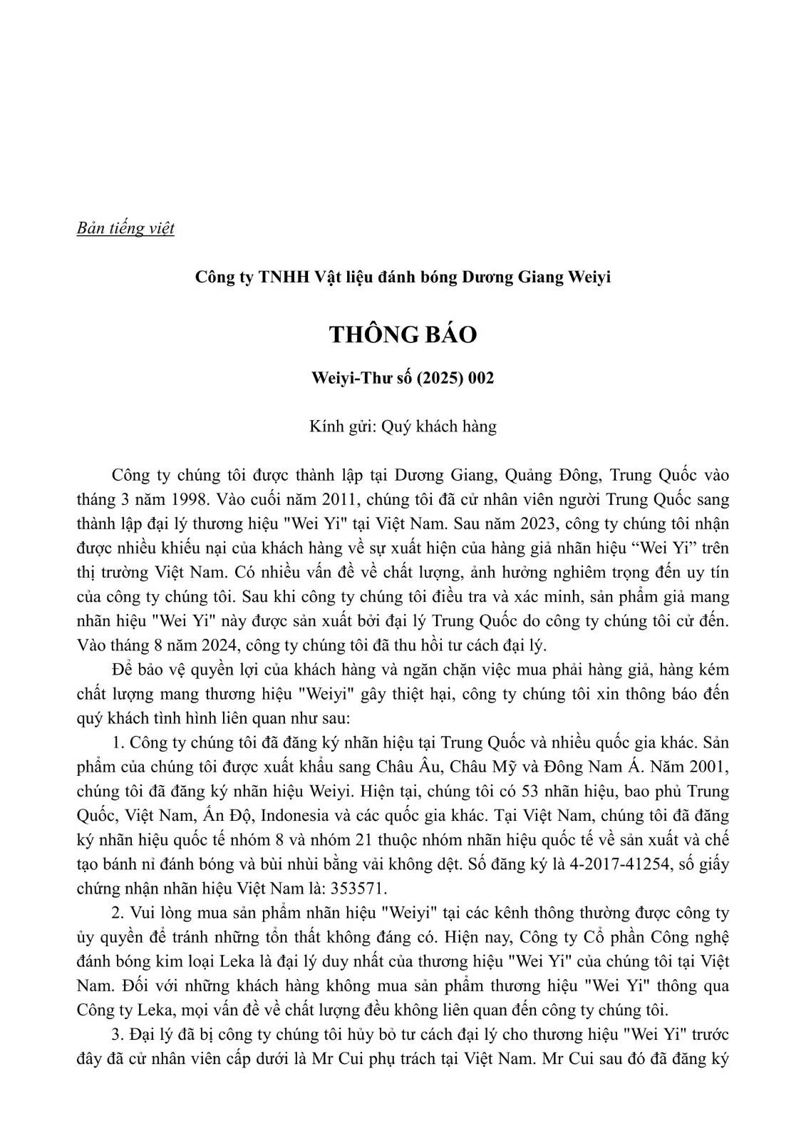 notice on weiyi brand in the vietnamese market